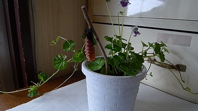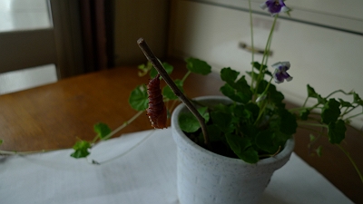 そうそう、最初の幼虫の時は、ひっつく枝がなくて、スミレの葉っぱの軸にぶら下がったので