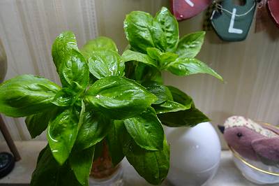 このバジルは昨年の秋から、枯れもせずコップの中で根を張って生き生きと育ってます~